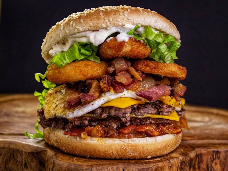 Abacaxi, onion rings, bacon crocante, ovo, carne, queijo cheddar, alface, maionese caseira e pão fofinho
